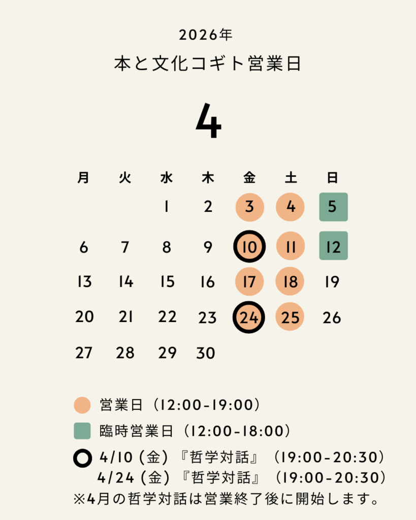 はじめに 本と文化 コギトで2026年4月の哲学対話を開催します。哲学対話は、正解を探す場ではなく、問いを囲んでゆっくり考える時間です。今月は、初めての方と、これま… -